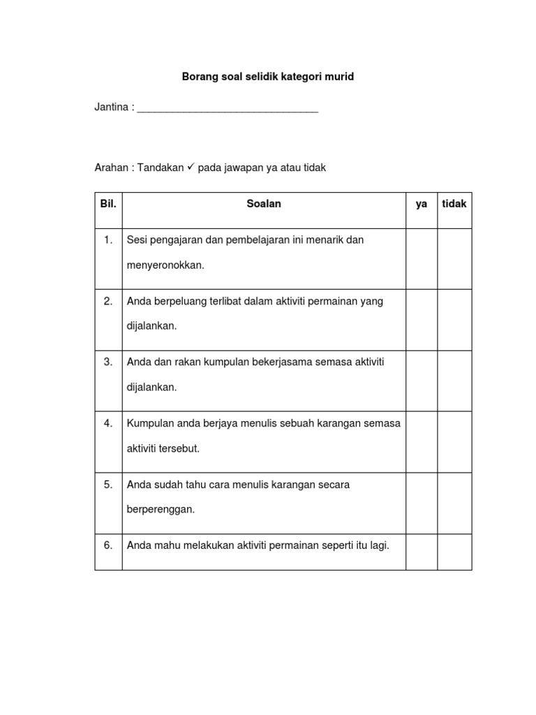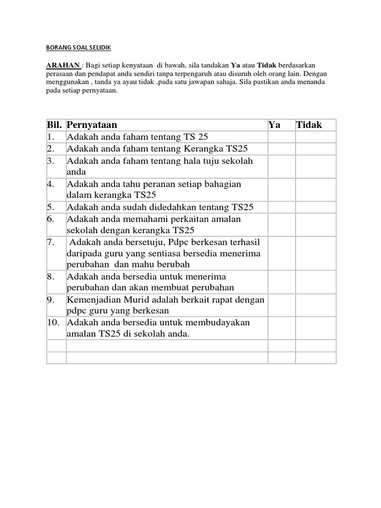 Borang Soal Selidik Ya Atau Tidak