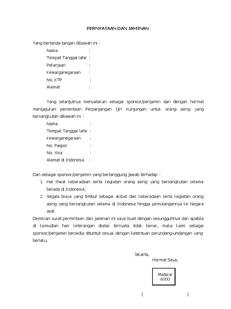 Surat jaminan untuk menjemput warga asing adalah bentuk lampiran kertas No 11 dan No 12 kepada Peraturan-Peraturan Pentadbiran No. Segala biaya yang timbul sebagai akibat dari keberadaan serta kegiatan Orang Asing yang bersangkutan selama di Indonesia hingga pemulangannya ke. SURAT PERNYATAAN SELAKU PENJAMIN.